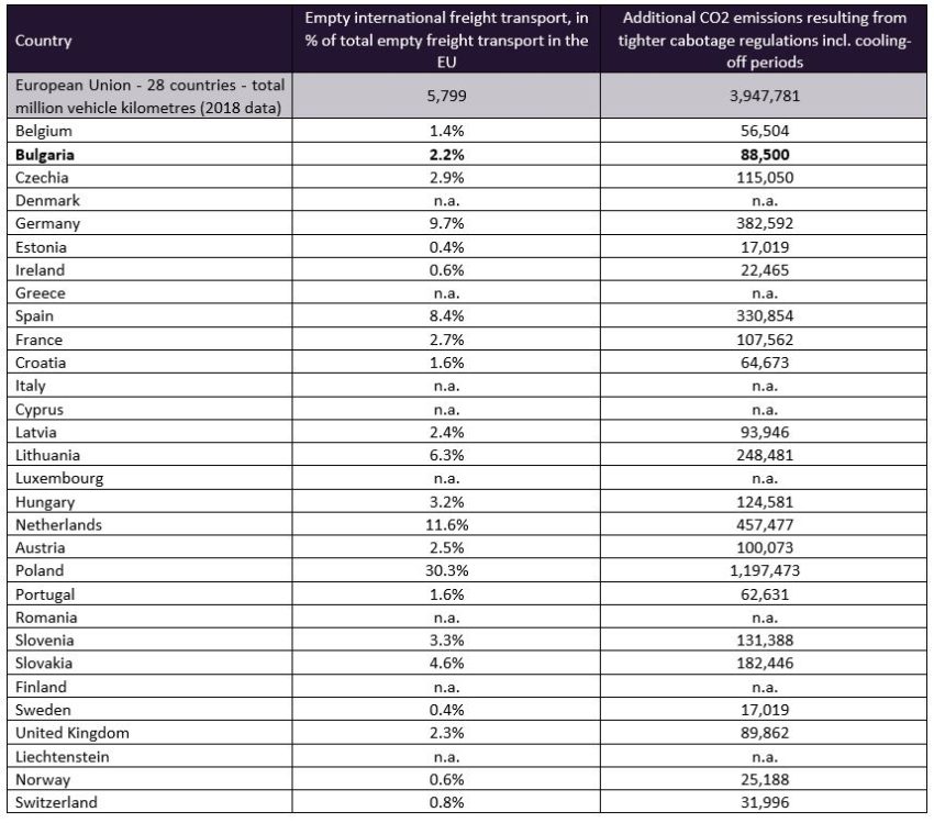 So let us simply assume that KPMG’s numbers for the Bulgarian haulage sector broadly reflect the changes cabotage and cross-trade operations of haulage companies that are based in other EU countries. According to Eurostat data, Bulgaria accounted for only 2.2% of EU-wide ‘empty international freight transport’ in 2018 (measured in million vehicle kilometres), which corresponds to an annual increase of 88,500 tonnes in CO2 emissions. These numbers can be extrapolated on the basis of Eurostat statistics on empty international freight transport.