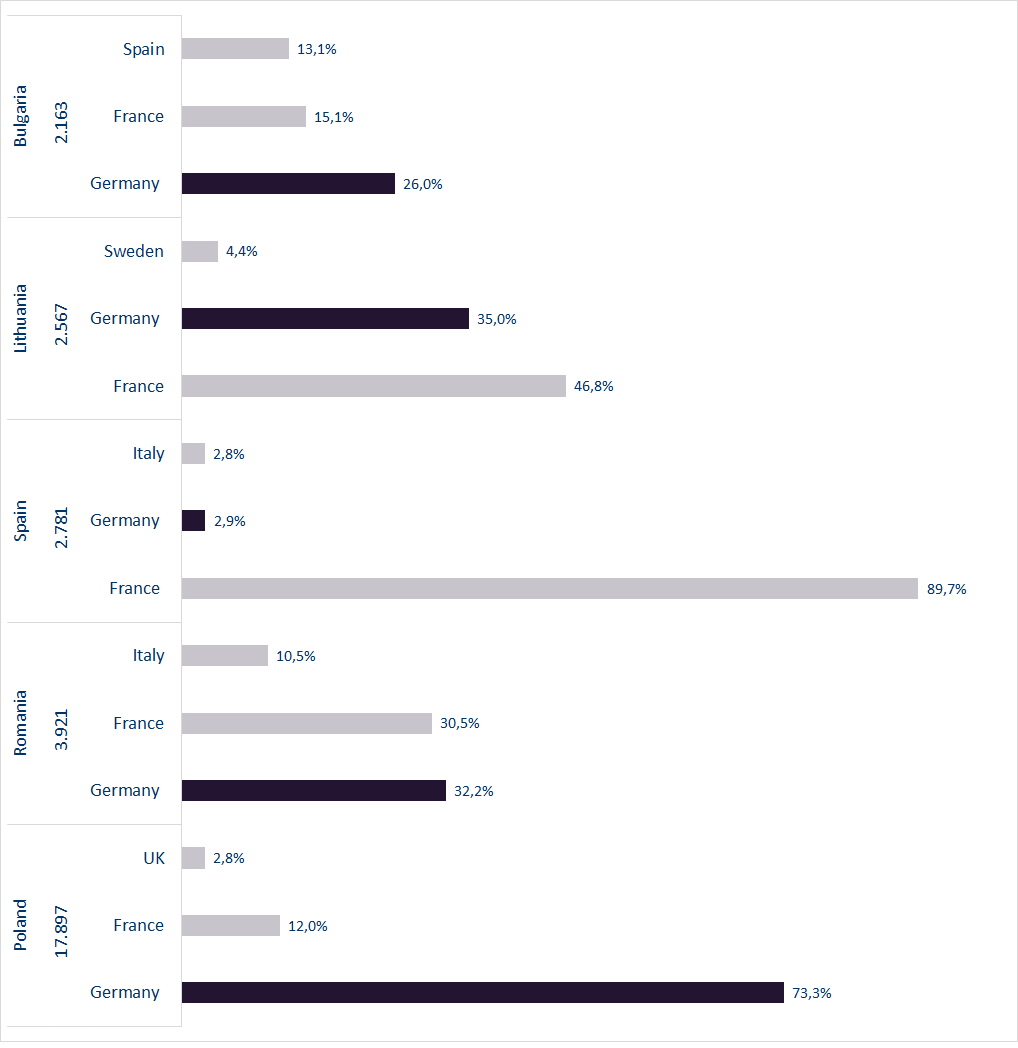 Figure 1: Top 5 cabotage performing countries and their main countries in which cabotage took place in 2017