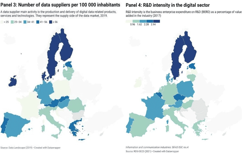 The actual maps below confirm these observations. The four panels look at different aspects of the broad data economy. Panel 1 shows patterns of high value-added specialisation, basically if economies are specialising in the fields of R&D industry sectors or in broad R&D-based data services. The greener a country is coloured, the more it is geared towards high value-added data services. Panel 2 shows the intensity of fast-growing firms in countries – and the bluer a country is coloured, the greater its intensity of fast-growing firms. Panel 3 shows the intensity of data suppliers in a country – and, again, the bluer the colour, the more data suppliers the country has per capita. Finally, panel 4 looks at R&D intensity in data services. The bluer the country is coloured, the higher the R&D intensity.