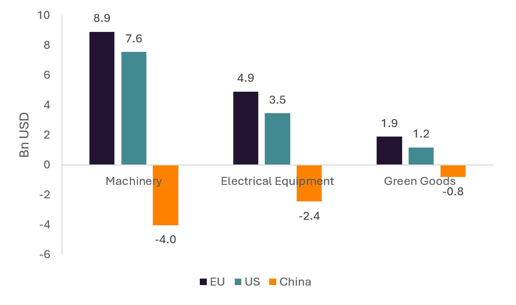 As the range of included goods expands and trade costs decrease further, we anticipate not only a significant rise in bilateral exports between the EU and the US but also a corresponding decline in Chinese exports of these environmental goods. This highlights the dual effect of the proposed MRA: it not only fosters transatlantic trade in key sectors for climate action but also shifts the EU and US supply of green goods and technologies away from China.