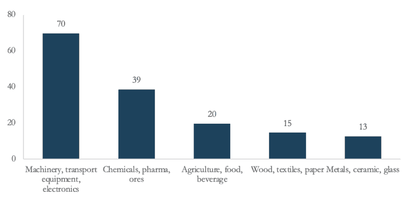 A ratio of 1 to 1 is a high bar to meet. Chinese exporters cannot ditch previous business commitments on a whim to sell their products to Russia. In our analysis, there were 157 product categories for which EU and US exports to Russia were at least one third of Chinese total exports. As shown in Figure 1, these products belong to the machinery, transport equipment, electronic, chemical, and pharmaceutical sector. However, the value of these exports is small, accounting for just 2 percent of Russian total imports. Yet, shortages of some products could permeate multiple economic sectors, in particular when these products are difficult to source somewhere else, are key inputs in the production of manufactured goods, or vital goods for citizen’s well-being like medicines.