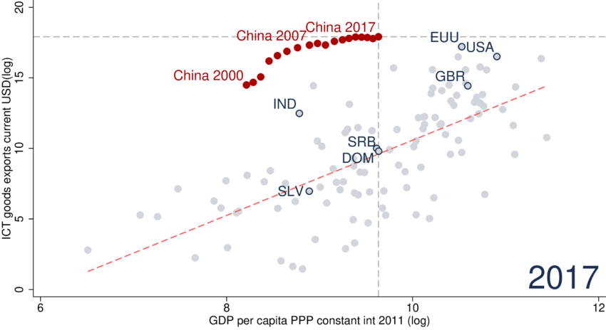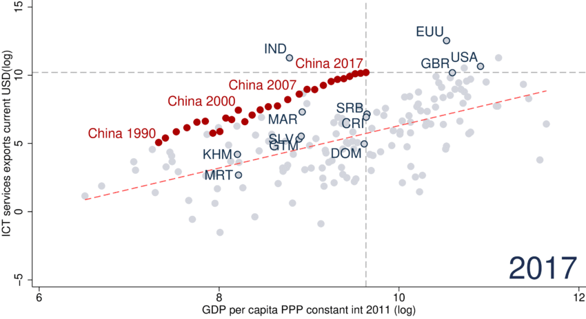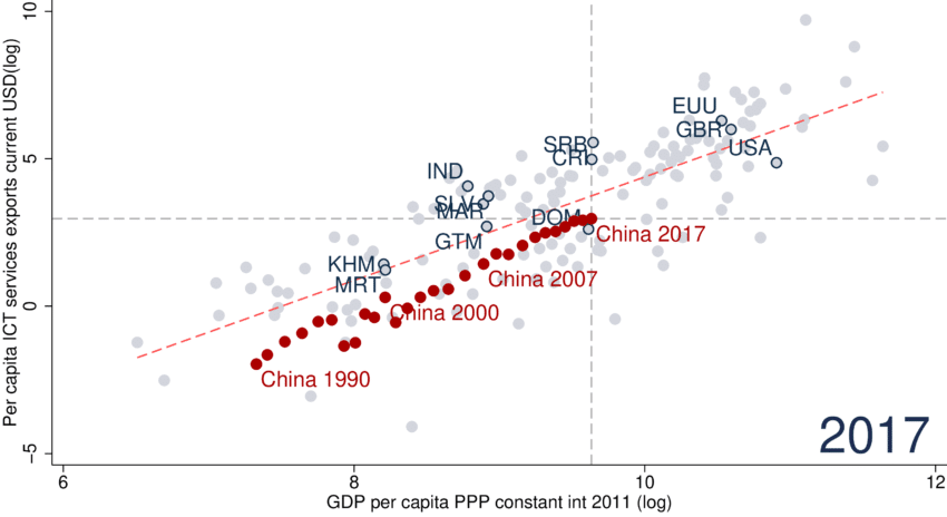 That was true in the past and is true in the present. For instance, back in 2000, when China shared a similar level of development as Cambodia today, the latter exported more digital services when the size of the market was accounted for. Similarly, in 2017, Guatemala was able to export more digital services on a per capita basis than China did in 2007; when the two countries shared a similar level of economic development. Today, China is as rich as Serbia or Costa Rica, but the two latter countries are far more competitive regarding digital services trade, given their rate of economic development.