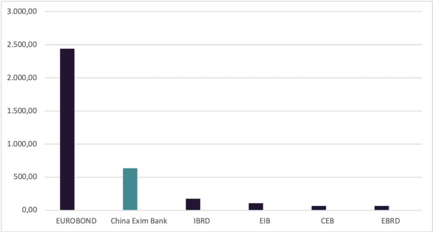 As of Q3 2024, Montenegro’s external debt continues to be substantially tied to the Chinese Exim Bank. The country is still repaying a substantial loan from the Chinese Exim Bank, originally taken out for the Bar-Boljare highway project. This loan has been a significant part of Montenegro’s external debt for several years. In addition, Montenegro also has considerable obligations through Eurobonds. These bonds have been vital to refinance public debt and manage the country’s financial stability. In the third quarter of 2024, the Chinese Exim Bank’s total foreign debt amounted to EUR633 million, representing 15,6% of Montenegro’s total external debt and 8,5% of the country’s state debt. China also emerged as one of the most important importing countries to Montenegro, next to Serbia, and the most important country in the import of machinery and transport equipment.