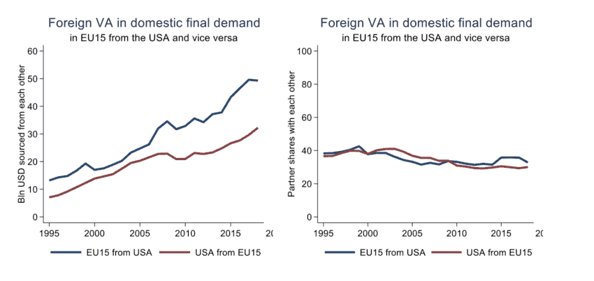 But a few remarks must be made here. One is that even though the EU15’s foreign share from the US is rising, the EU share in US foreign digital value-added is rising too, as the left-hand panel shows. Indeed, US firms and consumers are also fond of European digital services, and it doesn’t seem that they need less of our digital value-added anytime soon as their economy grows.