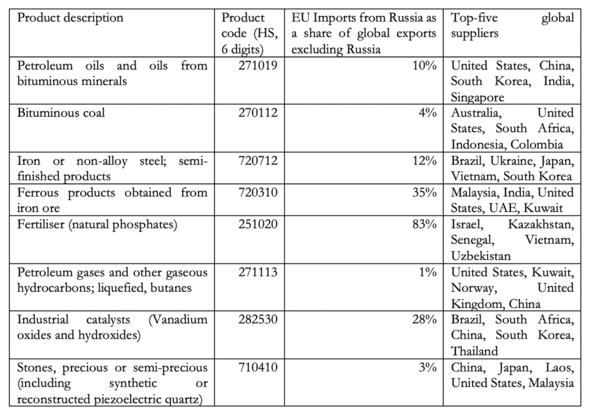 However, global exports are sold somewhere else and therefore are not really available. Moreover, for some product categories – particularly some kinds of fertiliser – EU imports from Russia represent a substantial share of global exports. For other products, such as gas, countries require certain infrastructure to receive these products from alternative suppliers, which lack of it can lead to shortages even if global markets can supply this product. Yet, Table 2 shows a static picture based on past trade patterns. Products in demand could be produced in new locations and extractions in current locations could be increased. Moreover, present dependencies are not necessarily the future ones as the EU is likely to lower its absolute consumption of hydrocarbons.