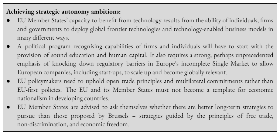 The EU’s strategic autonomy agenda is built on the perception that economic prosperity, technological leadership, and geopolitical power are a function of more and more targeted government intervention. However, no government or agency thereof has ever had superior expertise in steering economic activity in a way that its domestic economy or certain industries outperform the rest of the world. If there is one rule for wide and broad economic success, it is the fundamental commitment to maintaining economic freedom.