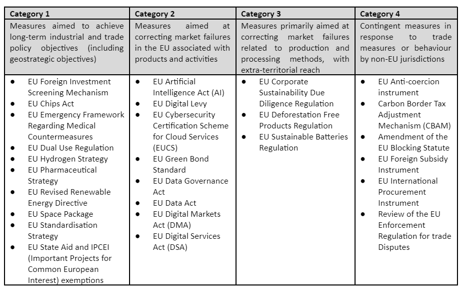 Source: Frontier Economics and ECIPE. It should be noted that these categories cannot be clearly delineated from each other. Some measures in category 1 include measures intended to address perceived market failures related to R&D. Some measures in category 2 also seek to enhance the competitive position of EU industries, while some category 2 measures can have extra-territorial reach. Also, some measures in category 4 can help address prevailing market failures such as asymmetric information about the extent of state aid and negative externalities caused by greenhouse gas emissions.