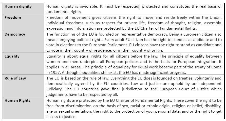 Table 2: Core values of the European Union