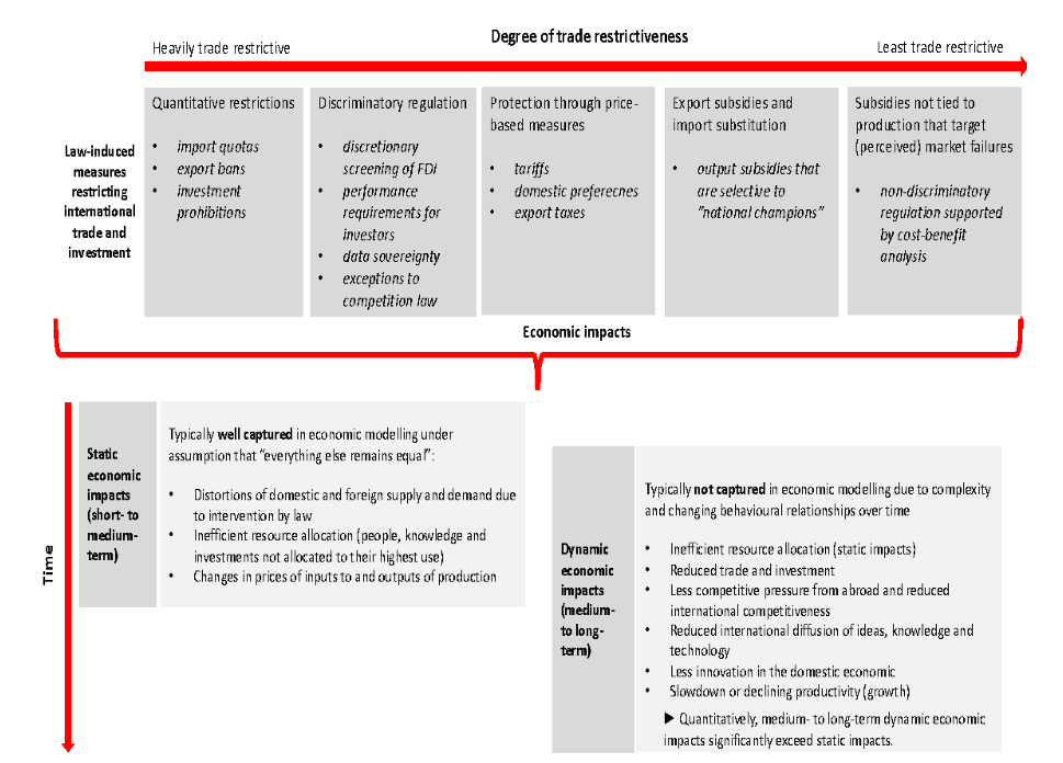 Figure 1: Static and dynamic impacts from policies restricting international trade and investment and how they are captured in economic modelling
