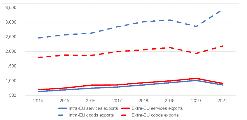 Figure 1: Development of intra-EU and extra-EU goods and services exports, 2014-2021, in EUR bn