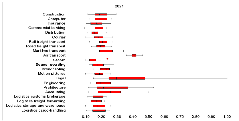 Table 1: Development of EU services trade restrictiveness and regulatory fragmentation, 2014 to 2021
