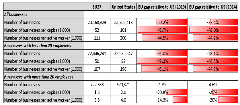 The number of businesses in the US is twice as high as in the EU
