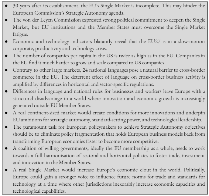 The paramount task for European policymakers to achieve Strategic Autonomy objectives should be to eliminate policy fragmentation that holds European business models back from transforming European economies faster to become more competitive.