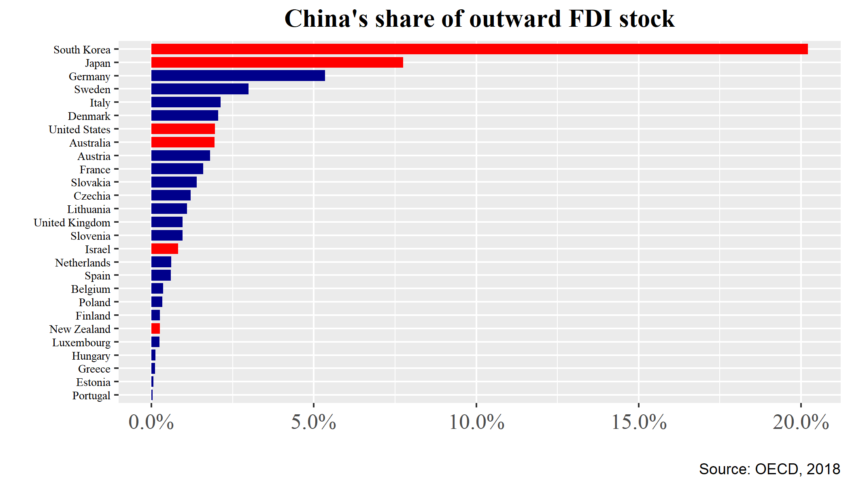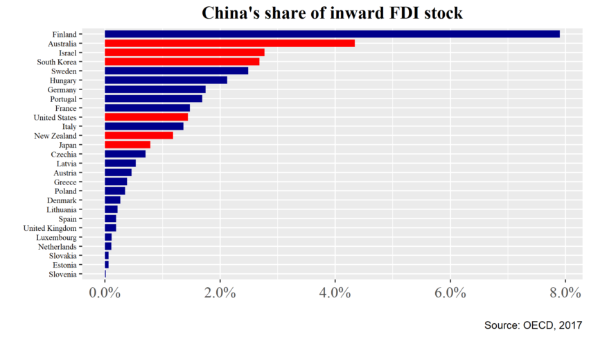 - At one extreme, 7.8% of Finland’s FDI stocks comes from China, whilst in Germany and France Chinese FDI accounts for less than 2%.