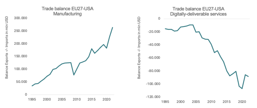 It is particularly evident in digitally deliverable services, which include management consulting, finance and insurance, cloud services, business processing, professional services and marketing. In these areas, the United States enjoys a large and growing trade surplus with the EU.