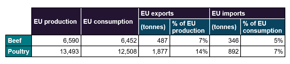 Table 1: Production, consumption, export and imports of beef and poultry in the EU (2023, thousand tonnes carcass weight equivalent)