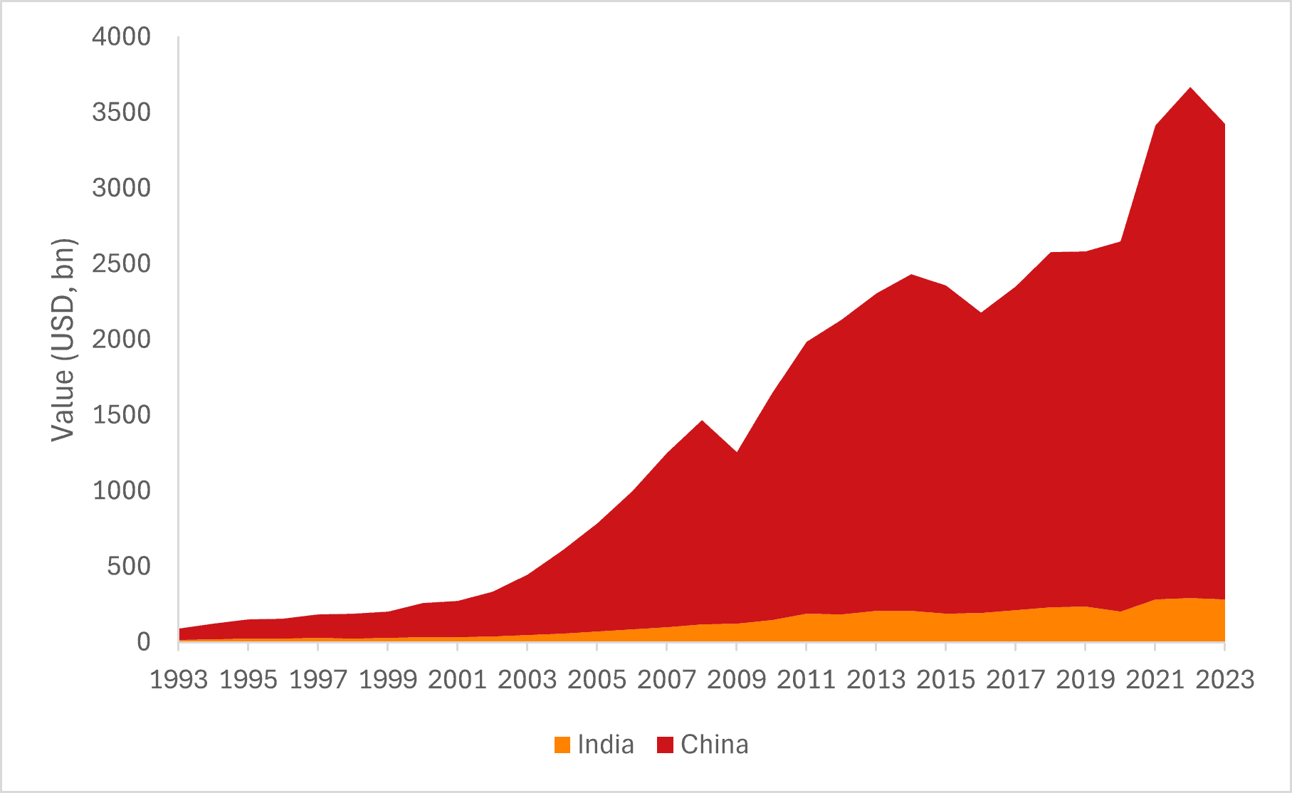 Figure 2: Global exports from China and India of manufactured goods (2013-2023)