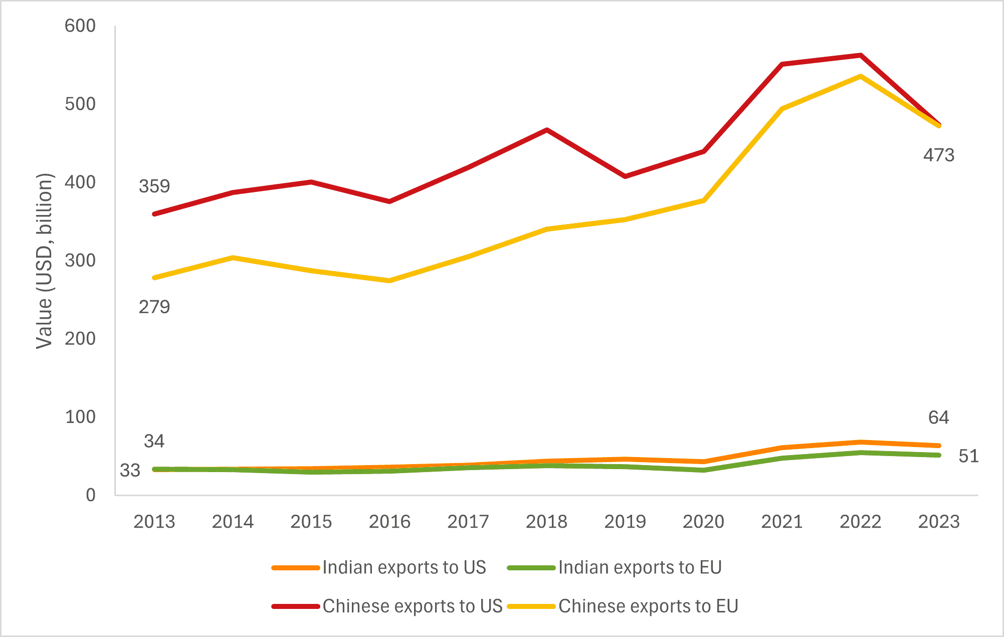 Figure 3: India and China’s exports of manufactured products to the EU and the US (2013-2023)