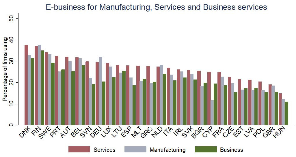 What can explain this? For one, our study shows that the low pick-up of digital technologies by services firms is an important factor to blame. For instance, using Eurostat data, the report shows that the share of business services firms in the UK and Poland that pick up digital technologies (as measured by our self-developed E-business indicator) is only half the rate of Denmark and Finland, as shown in the figure below.