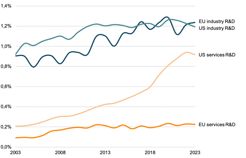 While Europe has kept up with the US on industrial R&D, when it comes to services, the continent has fallen dramatically behind. A €14 billion Transatlantic gap in services R&D in 2003 has ballooned to almost €200 billion today.