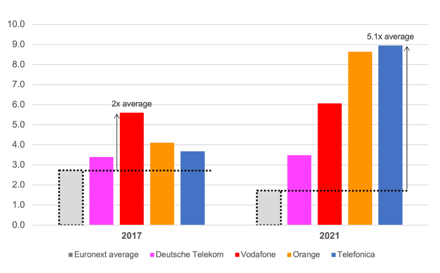 In the absence of other revenue streams, telcos’ management have few means to appease their investors and uphold the company share price. Their personal fortunes are also closely linked to market valuation via stock options. In this context, European operators exhibit a propensity to buy back their own shares and increase already-inflated dividend payments. As we see from the figure above, the EU’s largest telcos have consistently issued dividends that are well above the market average. To take an example, Vodafone has used nearly €5 billion of its own cash to buy back shares over the last five years, as well as spending at least twice that much on dividend payments (Reuters, 2021).