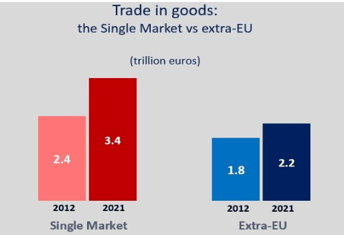 Although all these global forces also affected to some extent the Single Market, the intra-EU trade flows remained resilient. At the end of this turbulent period, the trade in goods within the Single Market stood strong, one extra trillion higher than in 2012.