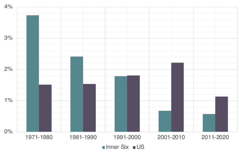 Figure: Average annual growth of Inner Six and US, GDP per hour worked by decade, 1971–2020 (percentage, constant prices)