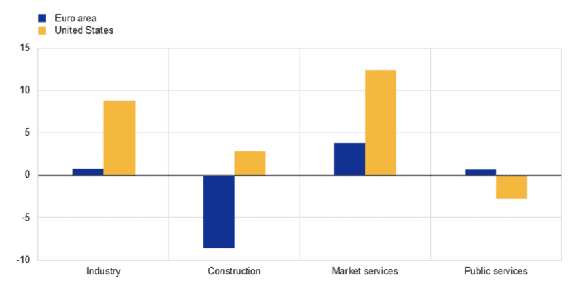 And what has been the development in the past five years? The gap remains substantial – and it is increasing. Between the fourth quarter of 2019 and the second quarter of 2024, EU labour productivity per hour worked increased by 0.9 percent in the Euro Area and 6.7 percent in the US. Developments under these years also make it abundantly clear where, more exactly, Europe fails. Consider the figure below, decomposing productivity growth between 2019 and 2024. There are very significant gaps between the Euro Area and the US in the two sectors that are critically important for long-run growth: industry and market services. Hourly productivity gains in the US in this period was five times higher than in the Euro Area, and it was three times higher than in market services. Helpfully, public services performed better in the Euro Area than in the US, and such development should not be dismissed: public services are a big sector. However, long-run growth will not from these services.
