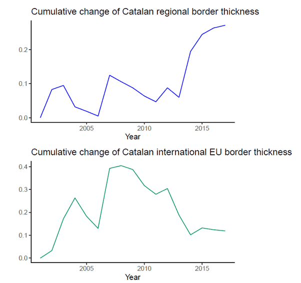 Figure 1: Change in the thickness of Catalonia’s trade border with the rest of the Autonomous Communities (top) and EU countries (bottom).