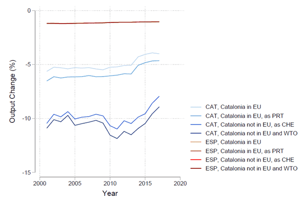 Confusing (without reading the full WP). More clarity required on the expected mechanisms. e.g. if independent Catalunya retained EU membership (i.e. no change in tariff and NTB situation for internal or external trade), why would there be any negative impact on output?