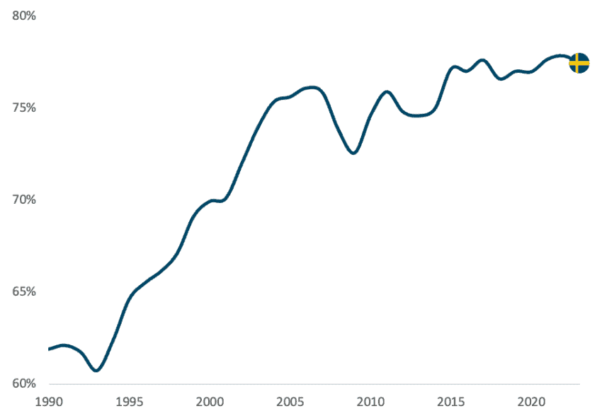 Figure 1: Sweden’s GDP per capita as a share of Switzerland’s, 1990–2023 (percentage, constant 2021 international dollars, PPP)
