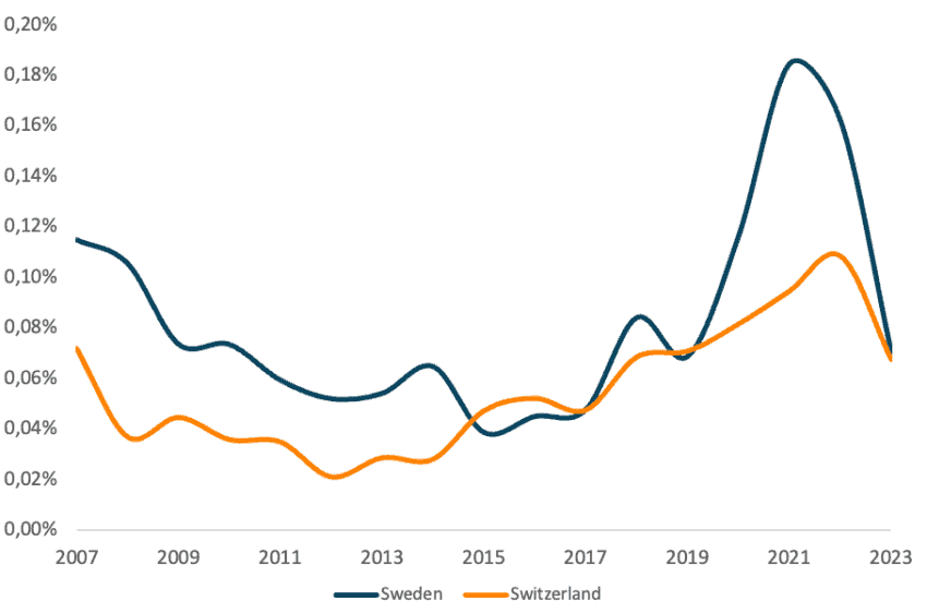 Figure 3: Venture capital investments as a share of GDP in Sweden and Switzerland, 2007–2023 (percentage)