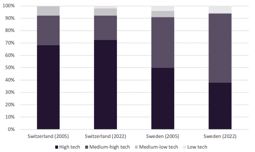 The first area to examine then is R&D intensity, that is R&D spending as a percentage of GDP. Interestingly, Switzerland and Sweden were virtually on par in 2021 – the latest available year for both countries – with 3.31% and 3.4% of GDP, respectively. By this measure, even if by a hair’s breadth, Sweden even outpaces Switzerland. Similarly, when analysing expenditure by sector of performance, business R&D in Sweden accounted for 72% of the total, compared to 68% in Switzerland. Once again, a small win for Sweden. Unlike for the EU, where low overall R&D investment and limited private sector involvement are prominent issues, these cannot possibly be the causes of Sweden’s slower economic performance relative to Switzerland. The focus then is to shift to the breakdown of privately funded R&D spending by firms’ technological profile. Figure 4 below highlights precisely this.