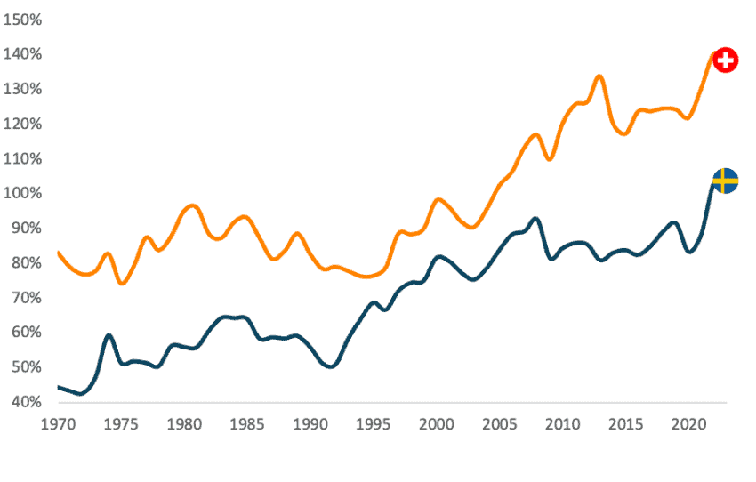 Figure 5: “Trade openness index” for Sweden and Switzerland, 1970–2023 (sum of exports and imports of goods and services divided by GDP, percentage)