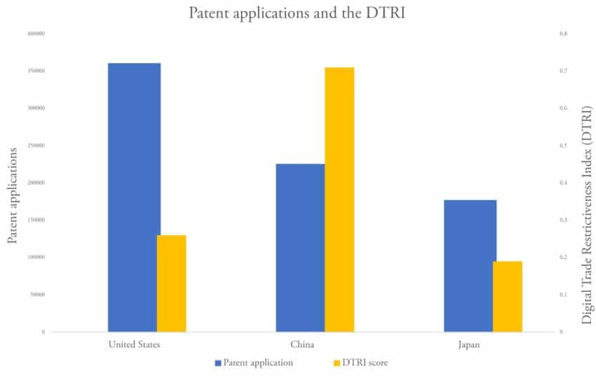 Admittedly, patents are not a perfect measure of innovation activities. New business models or management structure are not patentable, let alone that China might use them as a defensive instrument against imports. Nevertheless, such a surge in patent applications looks especially remarkable when considering the country’s high level of technology protectionism, with complex regulations governing the Internet and the ICT sector. According to ECIPE’s Digital Trade Restrictiveness Index (DTRI), China has in place the most restrictive measures in all aspects of digital trade, including content access, competition and data policy.