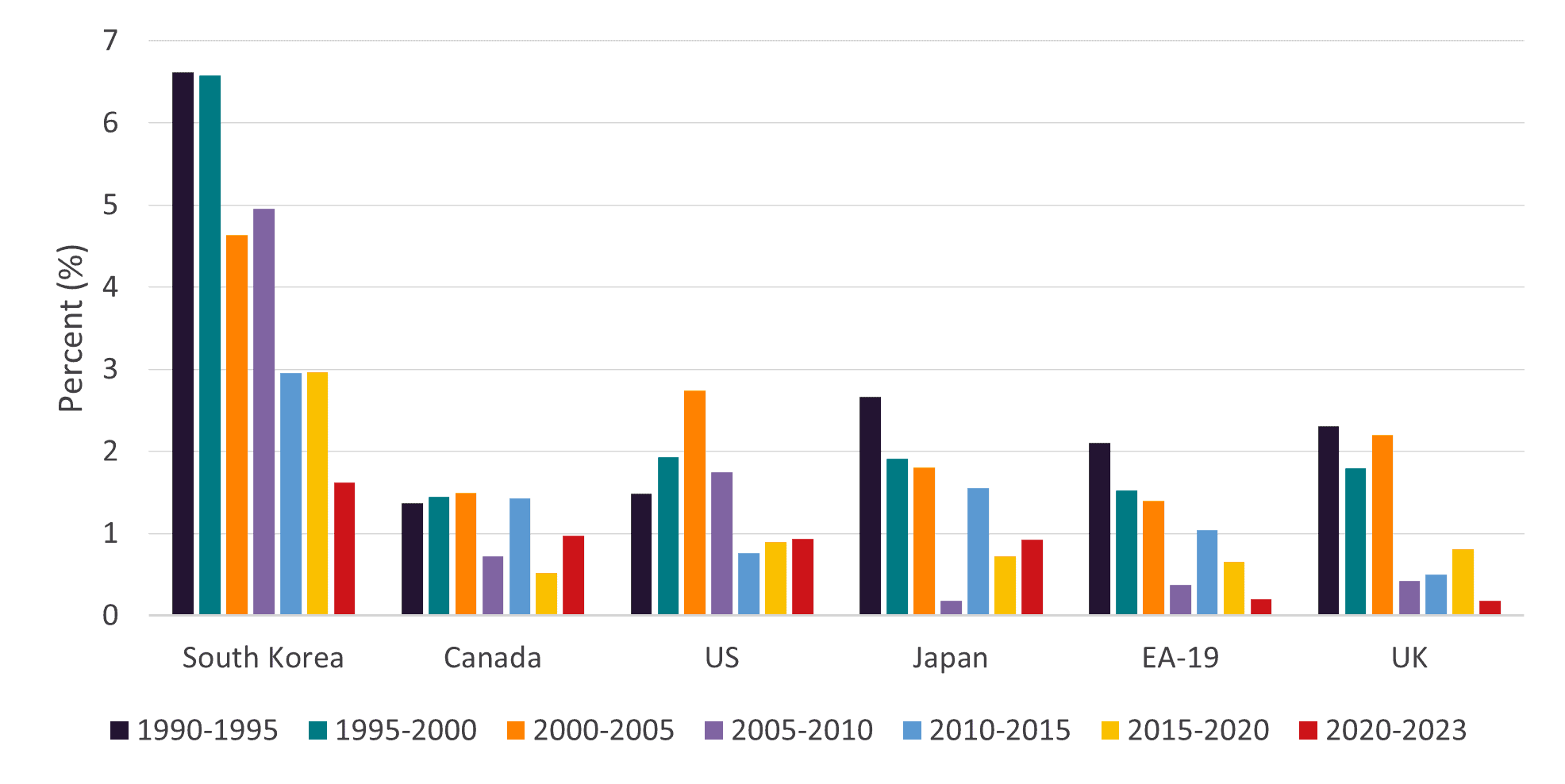 Figure 1 reveals an average decline of 1.9 percentage points in labour productivity growth across the six regions from 1990 to 2023. Europe experienced the sharpest slowdown, with growth in the Euro Area and the UK falling by more than a factor of ten. South Korea stands out: its high pre-2000 productivity stemmed from three decades of successful export-oriented policies, rapid industrialisation and catch-up growth.