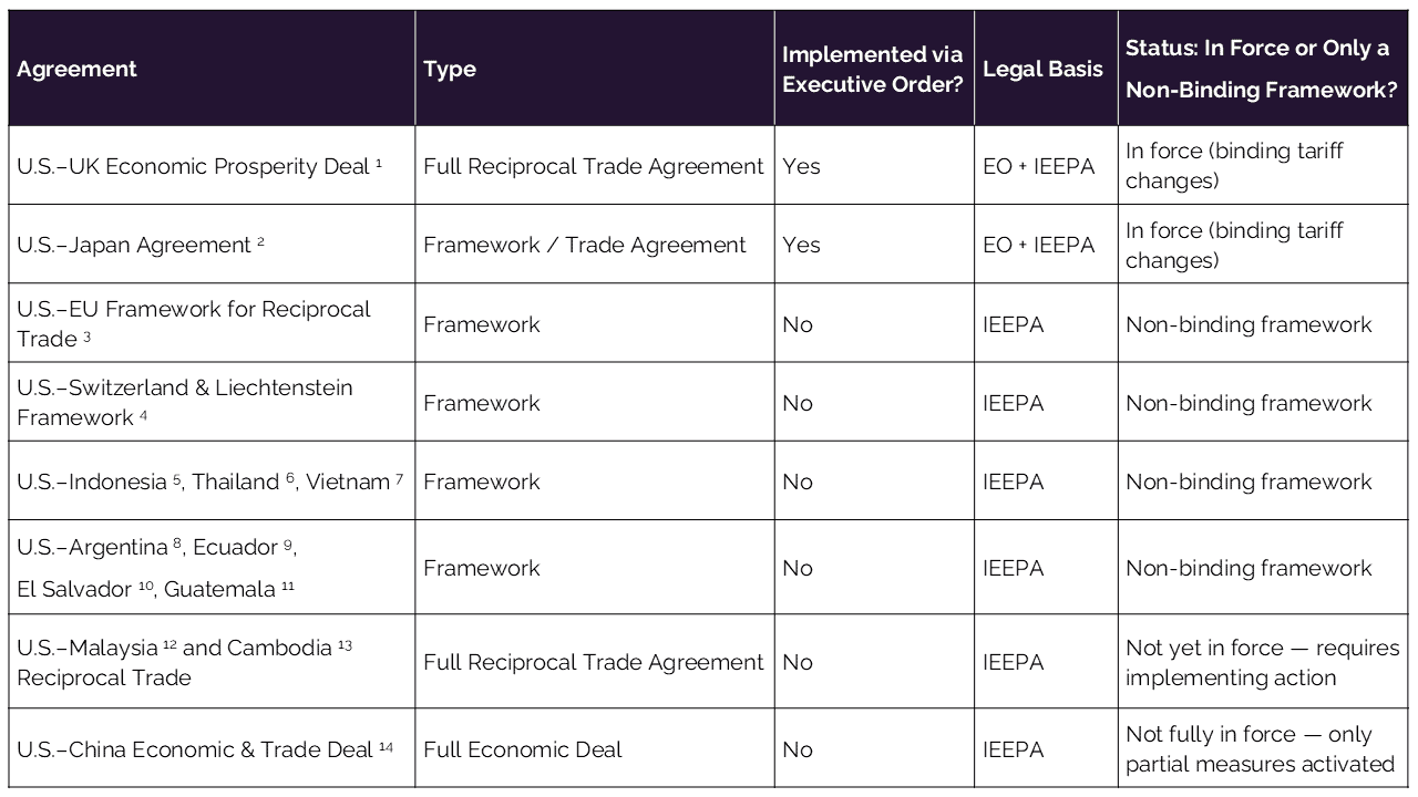 Table 1: Trade agreements and frameworks concluded under the Trump administration in 2025