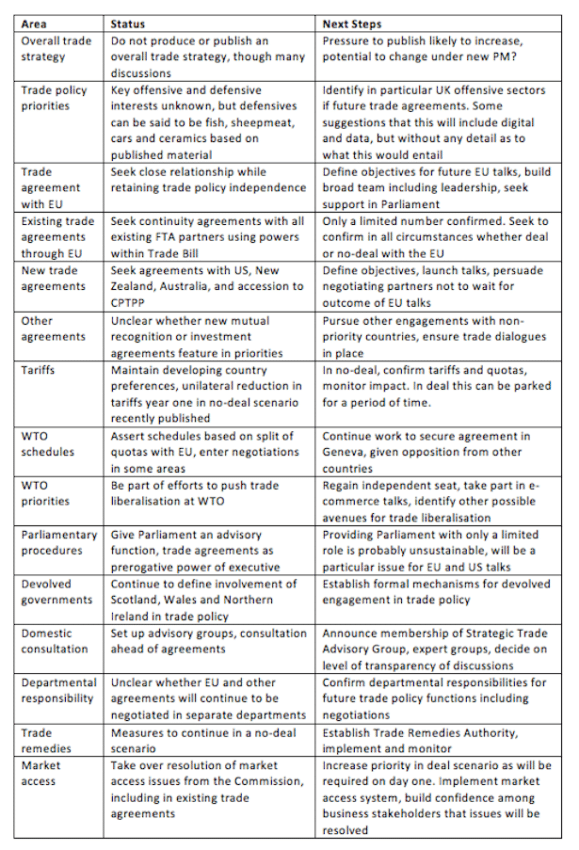 The first set of UK Trade Policy decisions to support both scenarios have been made, though not all have at the time of writing been published. The depth of commitment to these decisions has yet to be proved, and there is also little evidence that they have been robustly tested, particularly the extent to which there are conflicts between them.