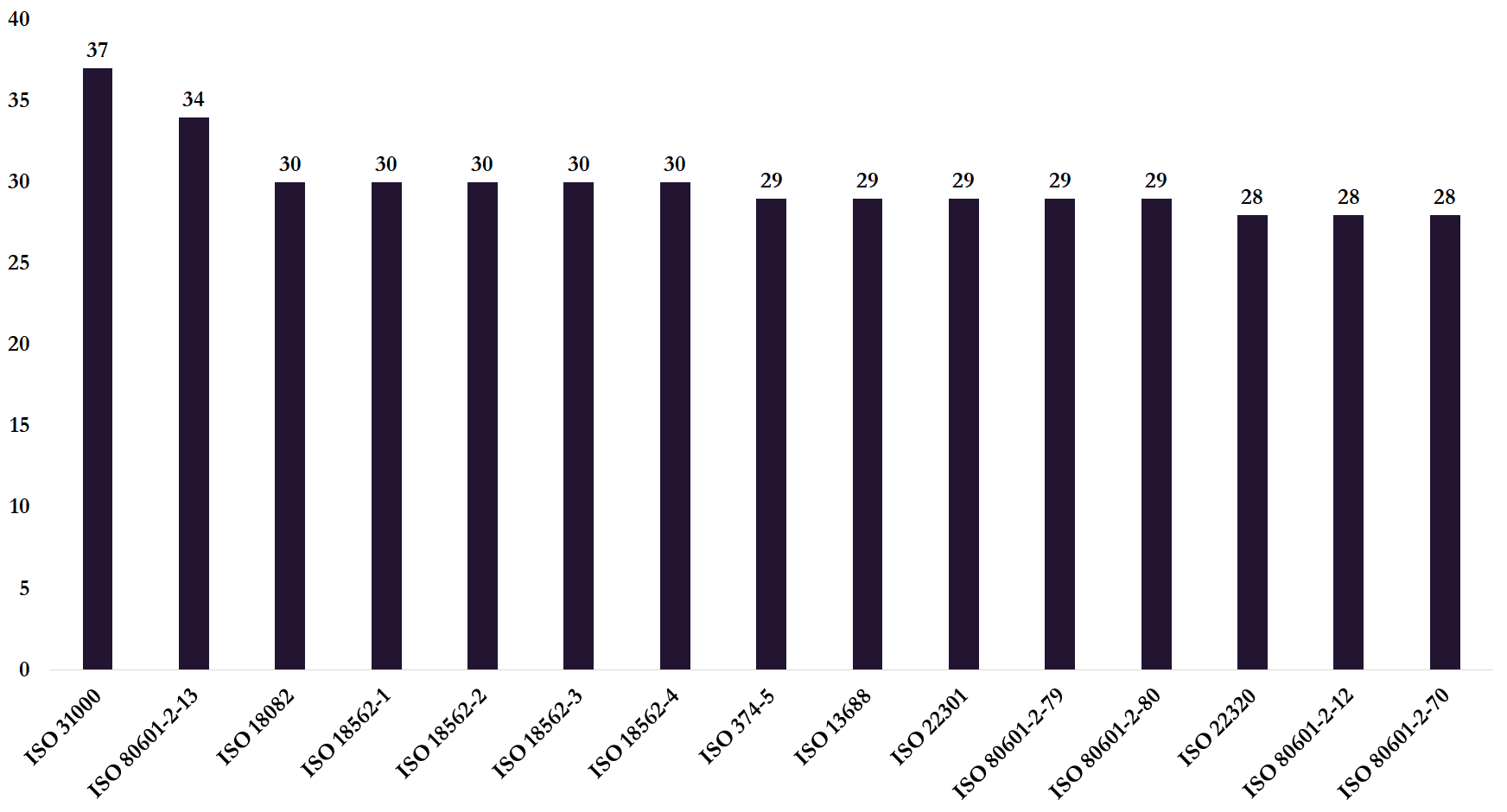 Take the standard ISO 80601-2-13. It’s an international standard for medical electrical equipment covering anaesthetic workstations and was made freely available by ISO to fight Covid19. This standard has been adopted by the European Standardisation body, and as such, it is a valid standard for all the EU countries. Besides, this standard is accepted in Brazil, Canada, Switzerland, Korea, Russia, and Turkey. The figure below shows some of the ISO standards which can be downloaded for free due to Covid19 and the number of countries where these international standards have been adopted as national standards.