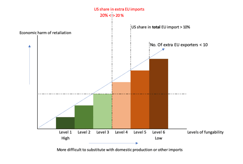I used six levels of fungibility. I started with the following question: does the US share of extra-EU imports represent more or less than 20 percent of total extra-EU imports in the product category? If the US share was less than 20 percent of the total extra-EU imports, the product would be allocated to levels 1-3 (depending on a few other analytical steps) and generally be treated as fungible. If the US share was higher than 20 percent, the product would fall in categories 4-6. To level up to category 5, there was an additional threshold to pass: the US share in total EU imports (including intra-EU imports) had also to be higher than 10 percent. In such a scenario the opportunity for substitution would be additionally smaller. And to get to level 6, the product in question would have fewer than 10 extra-EU importers – meaning fewer trading partners that could compensate for the loss of imports from the US.