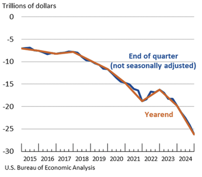 Markets should be concerned. One way to understand the reaction to the tariff package is to consult the US Net International Investment Position (see figure from the BEA below: the US NIIP by the end of Q4 2024), a measure of a country’s external assets and liabilities. It’s a balance sheet, so to say, over a country’s economic relation with the world. The US NIIP has had a remarkable development over the last ten years. Investments by foreigners in US held debt has expanded a lot and the US had a net position of -27 trillion US dollars by the end of last year. Obviously, the development speaks to the attractiveness of the US investment market – but it also shows a country that cannot finance itself and that needs to attract substantial amounts of capital from abroad. US public debt is part of the story, but the share of US treasuries held by foreigners has gone down in the past 15 years and stands at around one third of total public debt (here’s a good essay on US debt holding). Generally, however, the US economic model has developed to become very dependent on access to foreign investors.