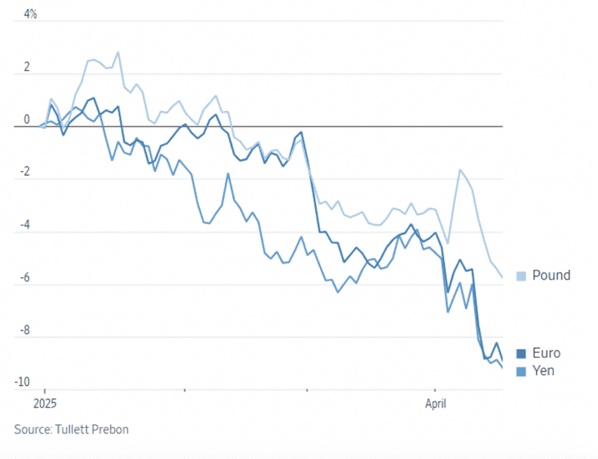 So what has Europe got to do with all this? Well, it is already caught up in the market turbulence. Stocks in Europe have tanked too. The euro and other European currencies have appreciated a lot against the US dollar in 2025 (see figure below for USD depreciation against the euro, the yen, and the pound). The dollar lost 5.5 percent of its value against the euro in just one week after the tariff announcement. It appreciated, at first, against some smaller currencies, but as the uncertainty connected to US bonds and stocks increased, the dollar continued depreciating also against them. If the development continues with a weakening dollar, bigger capital flows into the Eurozone, and a weakening business cycle export sales and corporate earnings in Europe will be impacted substantially. European exports, for instance, will become more expensive, leading to stronger pressures on economic activity in especially surplus countries like Germany. Disinflation pressures will become stronger, possibly affected by a China that may look to depreciate the Yuan. The good news is: we may not need to worry anymore about high inflation. And the bad news? The Eurozone may soon again face so strong disinflation pressures that we have to worry again about deflation risks.