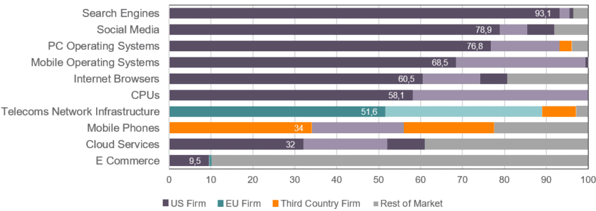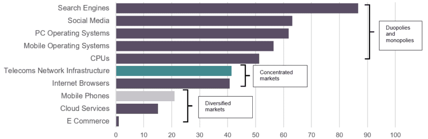 [1] For all markets, data is taken from the last available year. Telecoms Network Infrastructure refers to the North American market for 2019 as indicated by Dell’Oro. Search Engines, Social Media, PC Operating Systems, Mobile Operating Systems and Internet Browsers refer to the European market between January and September 2021 as indicated by Statcounter. Mobile Phones refer to the European Market between January and June 2021 as indicated by Statcounter. E-commerce refers to the European market for 2020 as indicated by Statista. CPUs refer to the global market between January and September 2021 as indicated by Statista. Cloud Services refer to the global market between January and March 2021 as indicated by Statista.