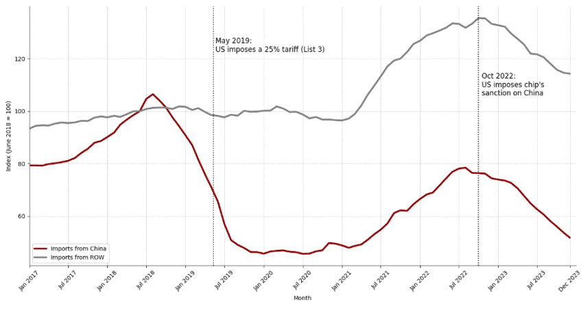 Bilateral trade exclusion occurs when two countries intentionally reduce their economic interdependence, usually through tariffs, export controls, investment screening, or regulatory barriers. The most straightforward instance is the US-China trade war, which began in 2018 with targeted tariffs and export restrictions on goods in key sectors like semiconductors, electronics, and green technologies. As shown in Figure 1, following the initial round of tariffs in August 2018, U.S. imports of semiconductors from China fell by more than 40 percent within a year, illustrating the immediate and significant impact of the trade restrictions on affected products.