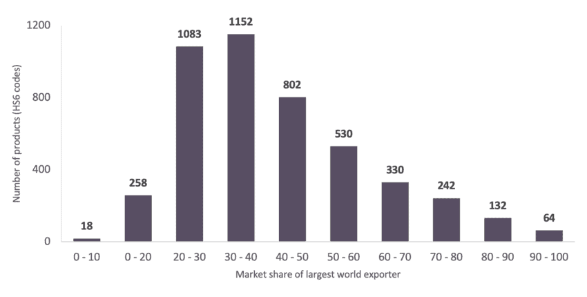 We studied the share of the largest exporters in world trade for all products in 2018, in order to produce the graph above. The total number of products were 4,611 and we looked at the export values of the 50 largest economies in the world, taking the EU as a single country. For each of these products we first found the largest exporter, followed by their share on total trade in each product, and then grouped together the products whose share of the largest exporter fell in a particular bracket (0-10%, 10-20%, so on).