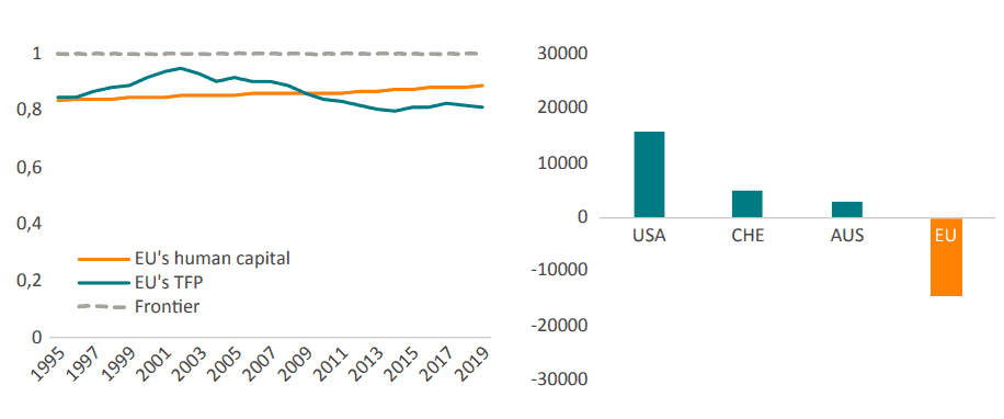 Figure 1: EU’s human capital and TFP developments against the US (frontier) and science human capital net flows