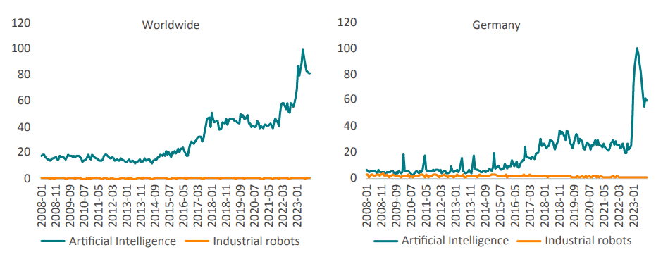 Figure 2: Monthly Google searches on AI related terms for World and Germany (2008-2023)
