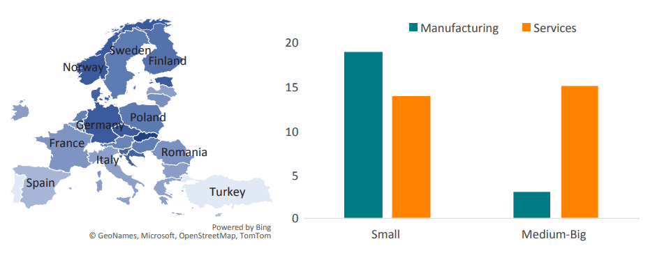Similar pattens appear when analysing small and big firms separately, even if some differences also emerge. Spain, France, Sweden, Ireland, and Norway reveal much lower pick up of AI by small firms. One big exception is again Portugal where smaller firms have a higher propensity to absorb AI than in most other countries, which probably explains its overall rate (as shown in Figure 3). And even though Germany is above the mean, other bigger markets like France and Spain are below Europe’s average in the adoption rate of AI in small firms.