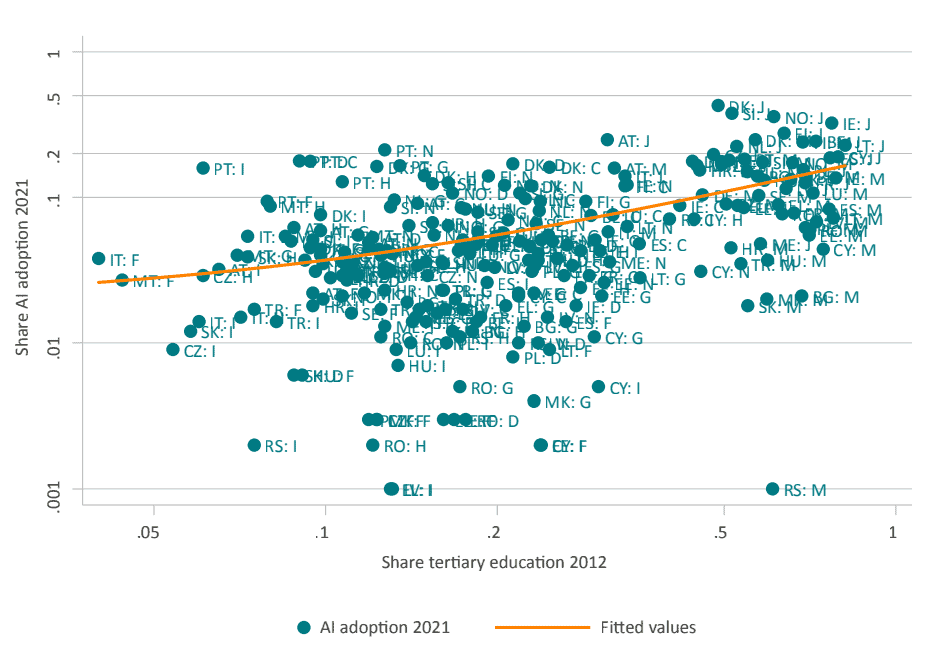 Source: authors’ calculations using Eurostat. Notes: The figure depicts share of university education 2012 in a country and industry and the share of firms adopting AI technologies in 2021 with a quadratic fit depicted by the red line. Log-scale used on both axis for better readability. Markers report 2-letter country code and 1-letter NACE industrial sector as defined by Eurostat.
