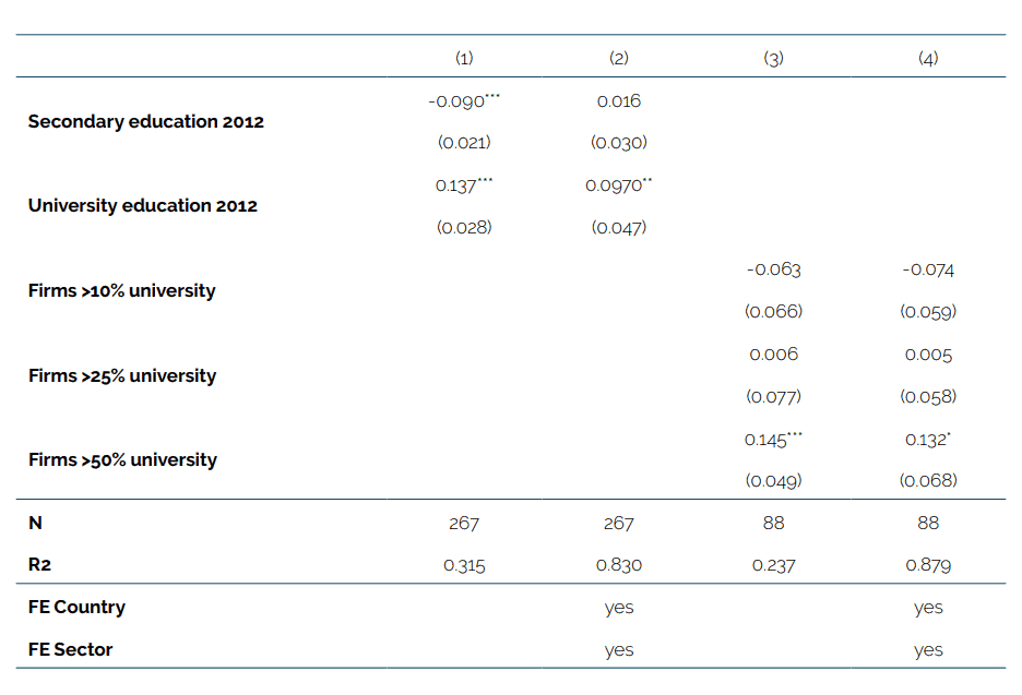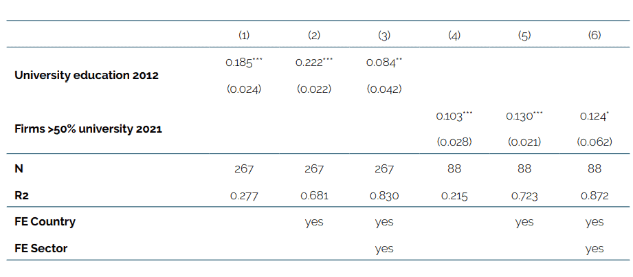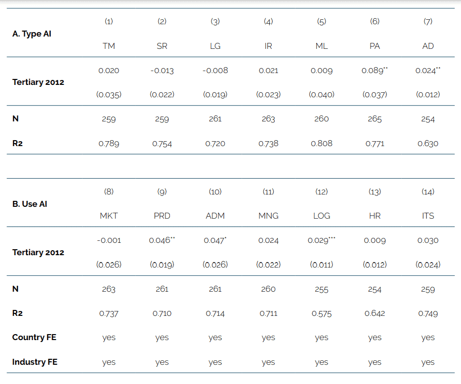 The results of our regressions are reported in Table 1. Column 1-3 shows that the coefficient results of our first human capital variable, namely the share of university education, comes out positive and significant across all entries. It confirms the persistent relationship between human capital accumulation and the early adoption of AI technologies: countries that had invested in human capital more intensively, and which were being used in sectors that needed them, explain AI adoption about a decade later. The sizable R2 highlights that the regression predictions approximate well the real data points, in simple terms predicted AI adoption based on human capital alone forecasts 27.7 percent of the variation in observed AI adoption in column 1. This significant outcome remains robust when including country and sector fixed effects as reported in column 3. However, the coefficient size in this column is reduced by more than half after accounting for country and industry specificities.